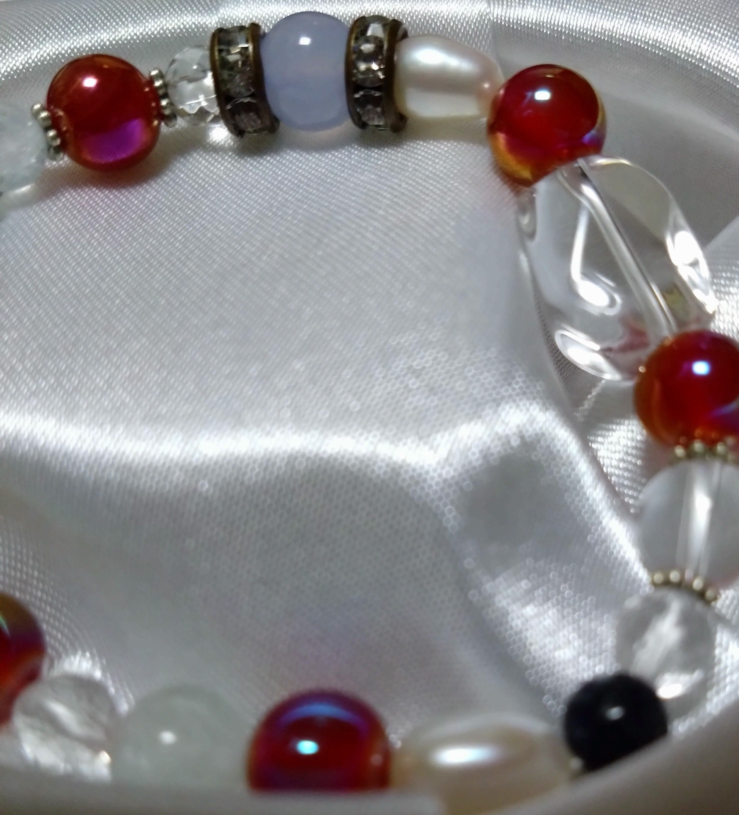 センターにブルーレースアゲート、周囲をオーロラクォーツ、クォーツ、オニキスの小ぶりの石を使用し組みました。